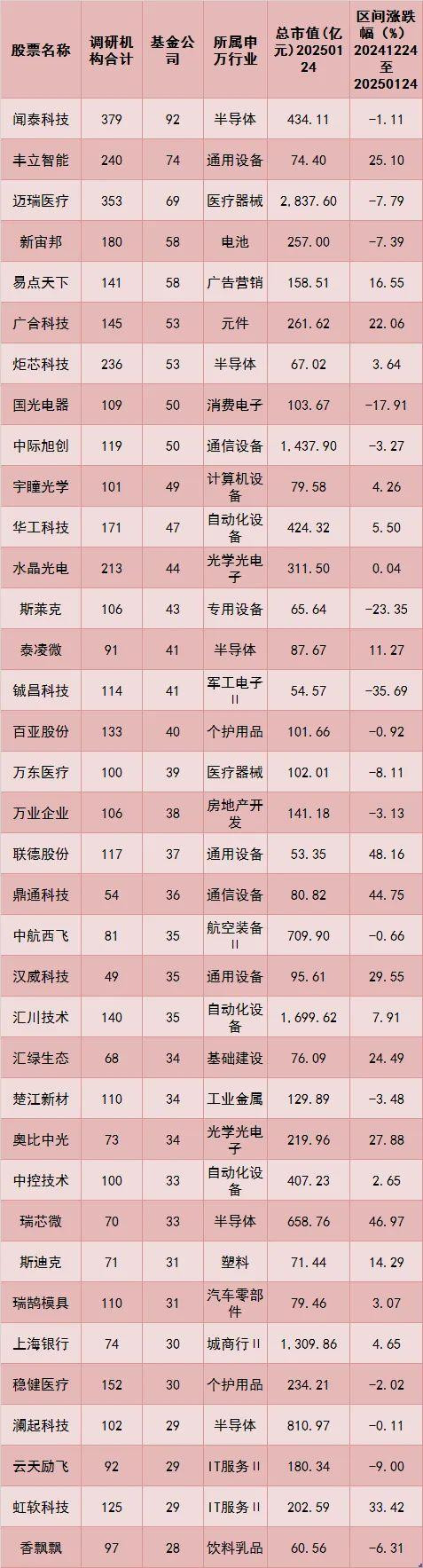 此外,新宙邦、易点天下、炬芯科技、广合科技近一个月被超过50家基金公司调研,中际旭创、国光电器、宇瞳光学、华工科技近一个月被超过45家基金公司调研。